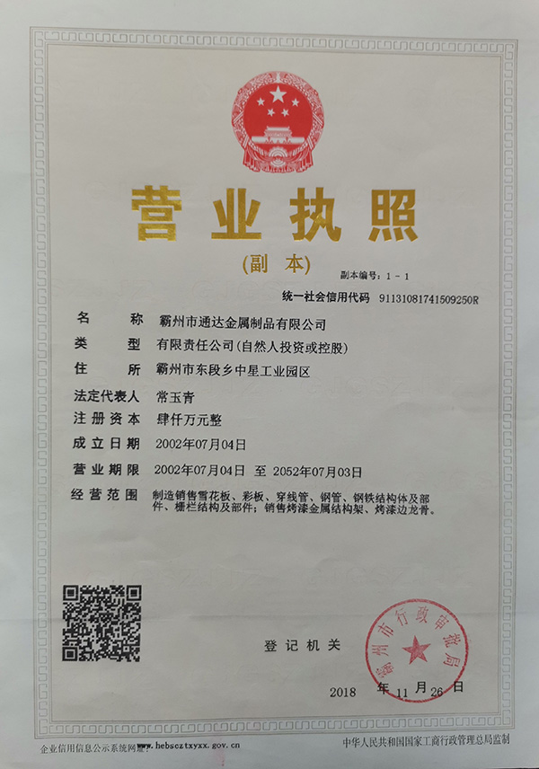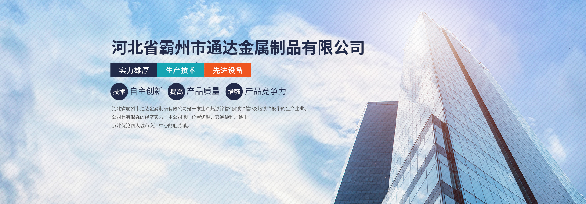 河北省霸州市通達金屬制品有限公司是一家生產(chǎn)熱鍍鋅管<預(yù)鍍鋅管>及熱鍍鋅板帶的生產(chǎn)企業(yè)。公司具有很強的經(jīng)濟實力。本公司地理位置優(yōu)越,交通便利,處于京津保滄四大城市交匯中心的勝芳鎮(zhèn)。由于公司不斷發(fā)展壯大,良好的投資環(huán)境為我公司的發(fā)展提供了可靠的保障。本公司是河北省重合同守信用企業(yè),被評為AAA級信用企業(yè)。